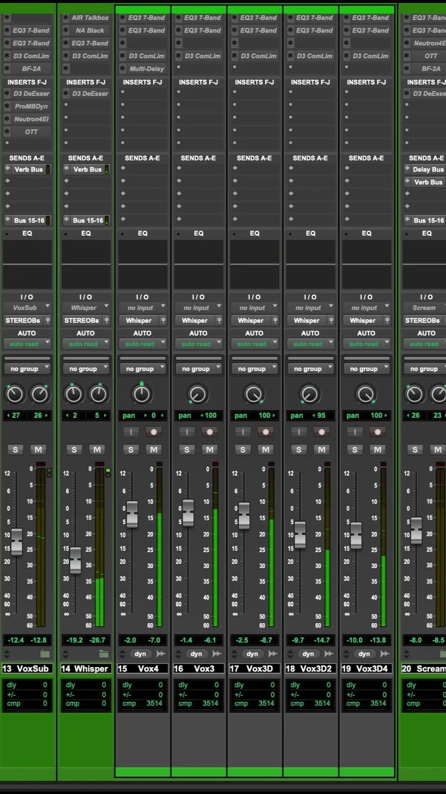 Naturally, the vocals sat in the very front of the mix. I broke them down into different buses based on the type of vocals they were. They all had doublings and each set of tracks was made for different sections. I explain each group more in depth below.